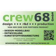 Die crew68 GmbH mit Sitz in Murnau ist ein modernes Unternehmen, spezialisiert auf Modell- und Prototypenbau. Wir begleiten den gesamten Prozess von der ersten Idee bis zur Serienfertigung und legen dabei großen Wert auf Kreativität, Präzision und Qualität.
