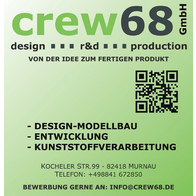 Die crew68 GmbH mit Sitz in Murnau ist ein modernes Unternehmen, spezialisiert auf Modell- und Prototypenbau. Wir begleiten den gesamten Prozess von der ersten Idee bis zur Serienfertigung und legen dabei großen Wert auf Kreativität, Präzision und Qualität.